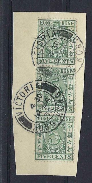 Hong Kong | F12 | 3 | 5c green in a strip of 3 on piece. | FU | £30.00 | ||