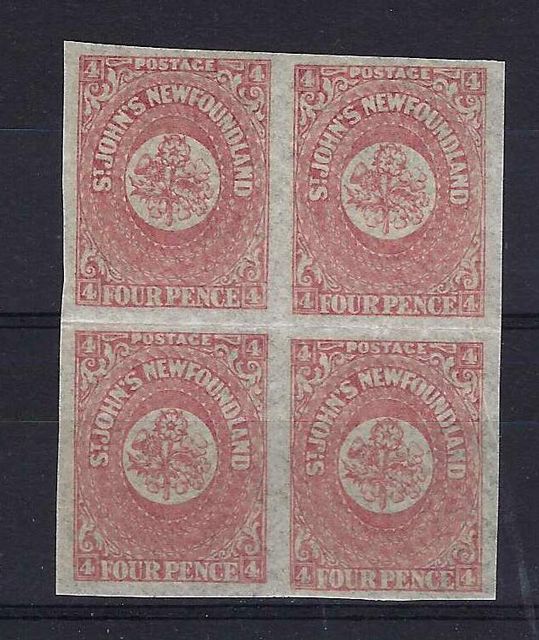 Canada-Newfoundland | 18 | 4 | 4d rose lake in a block of 4. Horizontal file crease through margin. | UMM | £160.00 | ||