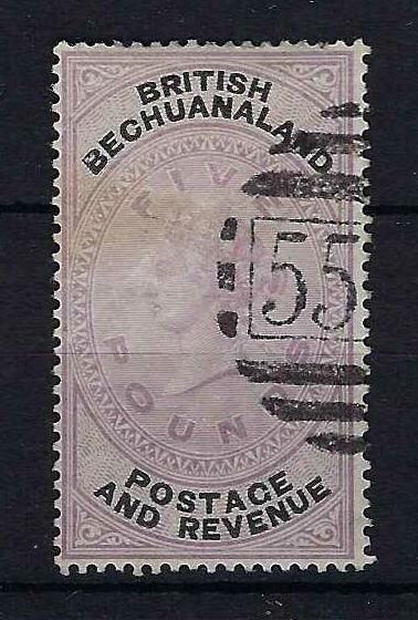 Bechuanaland - British Bechuanaland | 21 | £5 lilac & black. Cleaned of a fiscal cancel. Forged obliteration then applied. Stunning space filler. | FISC | £90.00 | |||