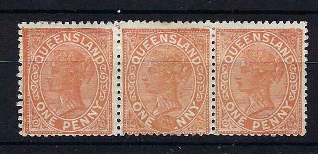 Australian States ~ Queensland | 206/206b | 3 | 1895. 1d vermilion-red in a horizontal strip of 3 one of which has the PE OF PENNY OMITTED variety. | MM | £195.00 | ||