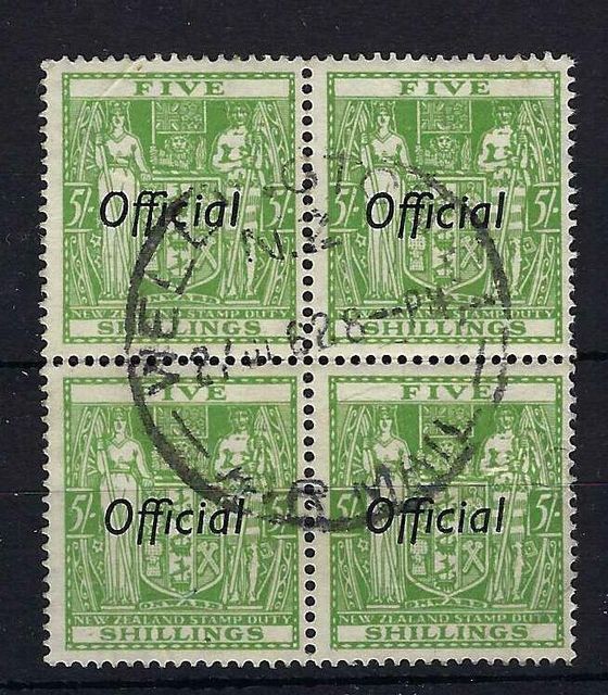 New Zealand | O133b | 4 | 5/- yellow green perf 14 x 13.5 in a block of 4. | FU | £75.00 | ||