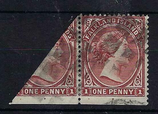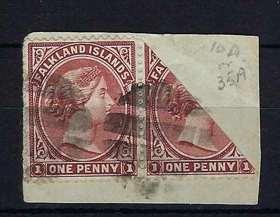 Falkland Islands | 11/11Var | 2 | 1889-91 1d red-brown in a horizontal pair one of which has been bisected diagonally and tied to a small piece. | FU | £225.00 | ||