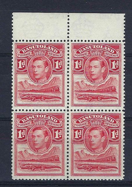 Basutoland/Lesotho | 19/19a | 4 | 1d scarlet in a top marginal block of 4 one of which has the TOWER FLAW. | UMM | £125.00 | ||
